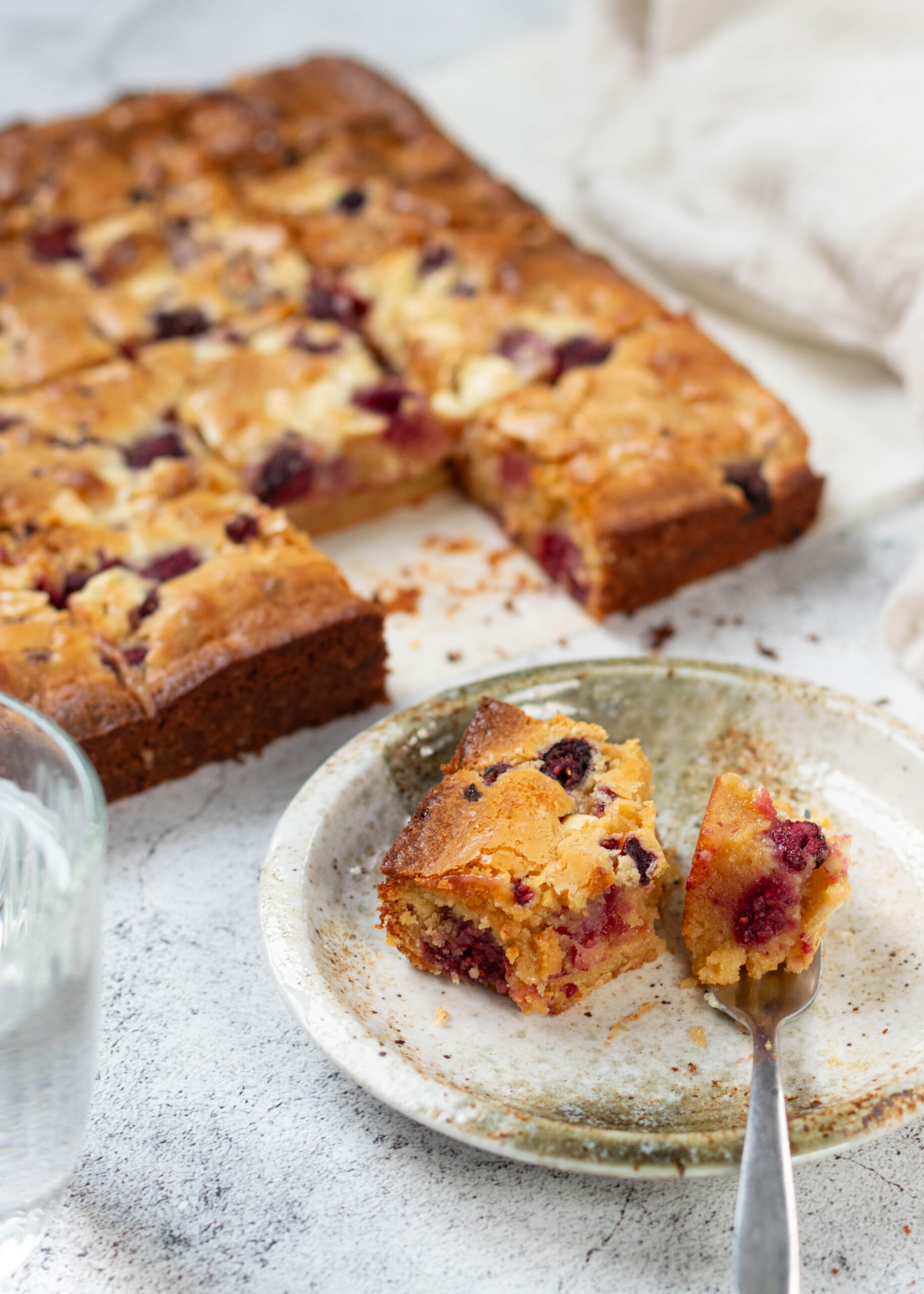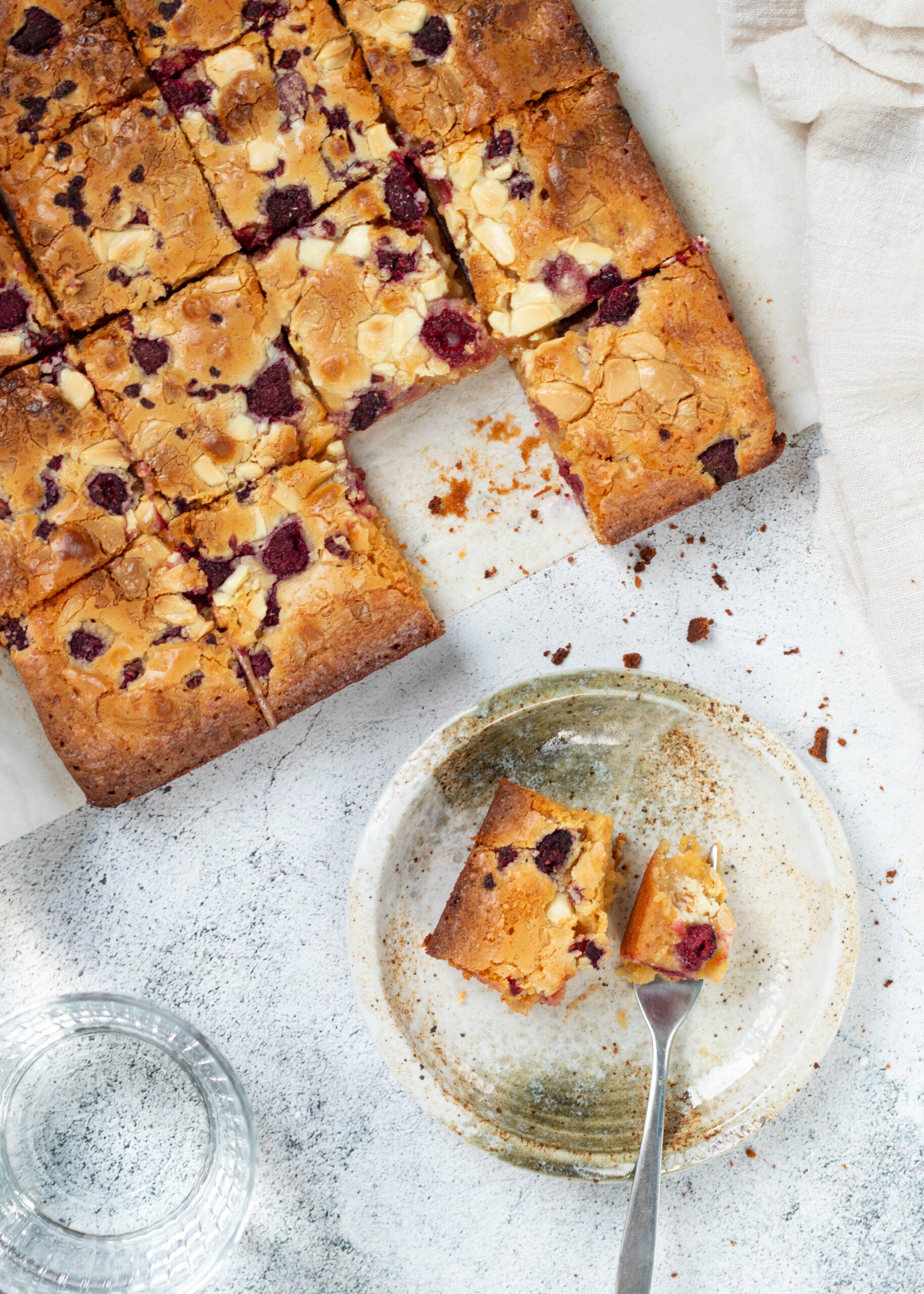 Smeuïge blondies met witte chocolade en frambozen (zonder mixer!)